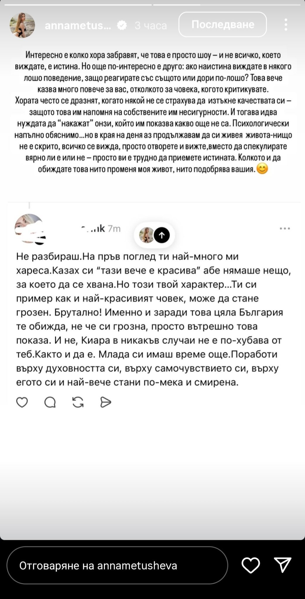 Анна целеше да обиди Дениз като я нарече пилонаджийка - думите ѝ трябваше да внушат на слушателите, че Дениз танцува гола на пилон в столични заведения. Което не е така. Дениз уточни, че е вземала уроци на пилон заради клипа и че там има кадри на него. Но кадрите, които визира Анна действително не са на Дениз, а на друго момиче от клипа. И колко е долна Анна - визира и навира на хората пред очите неща от миналото на млад човек /клипа е от поне 5 години, а връзката с Ицо поне от преди 10/. Аз вярвам, че Дениз иска и е отворила нова страница в живота си. Не мога да я съдя за миналото ѝ. Всеки прави грешки. Важното е какви поуки си вземаш от тях. За психологията, която учи - тя тъкмо я беше започнала в първият сезон на Ергенът. Това си го коментираха с "ветерана" по психология Александра /боже, какви неща помня/. И друго се сещам - в един откъс от подкаста на Ивка Бейбе, Дениз каза, че скоро си гледала представянето от първия Ерген и ... не се харесва там.