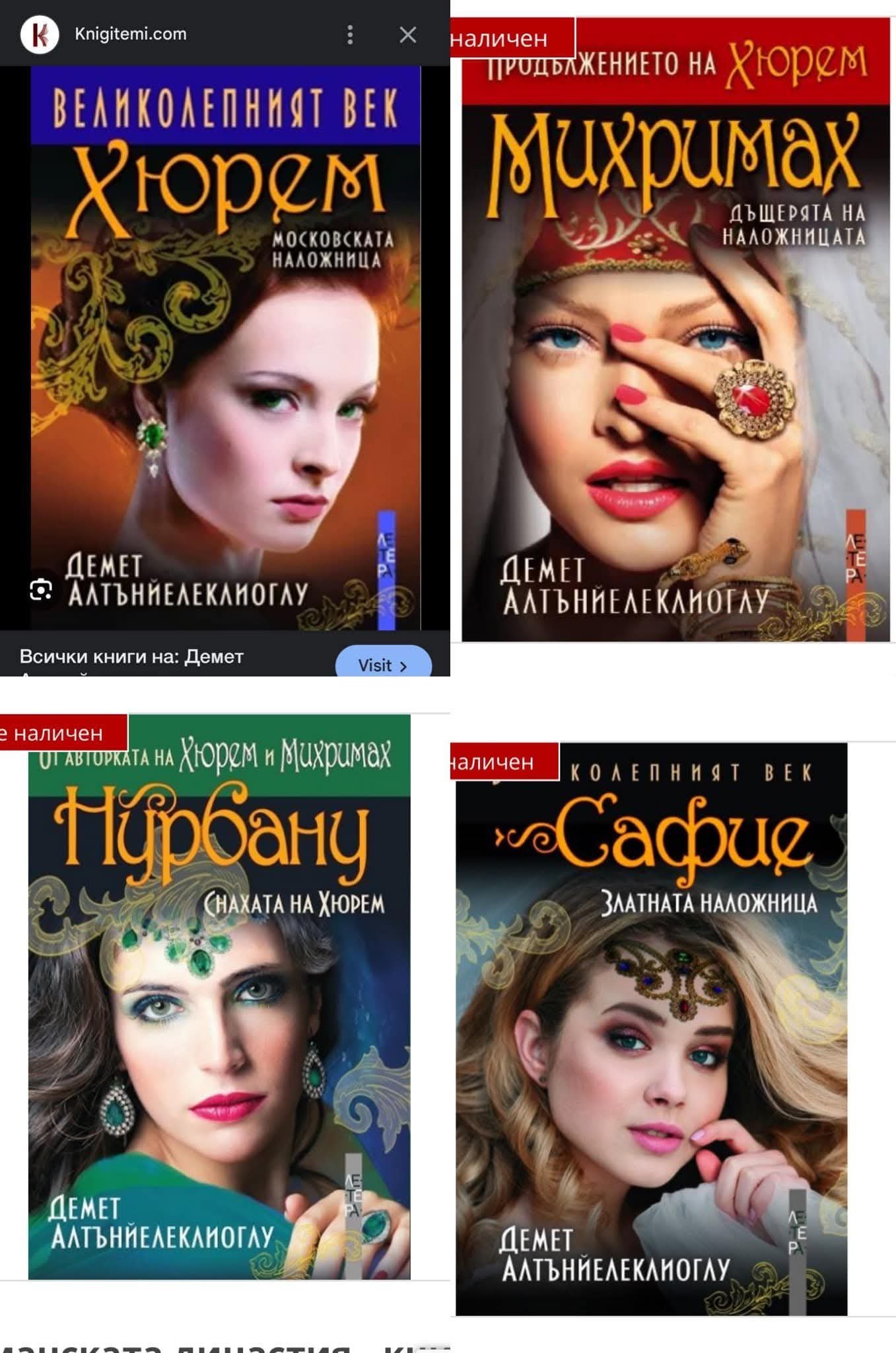 Здравейте, търся книгите Хюрем, Михримах, Нурбану и Сафие. Бих се радвала и на отзиви за тях. Благодаря предварително!