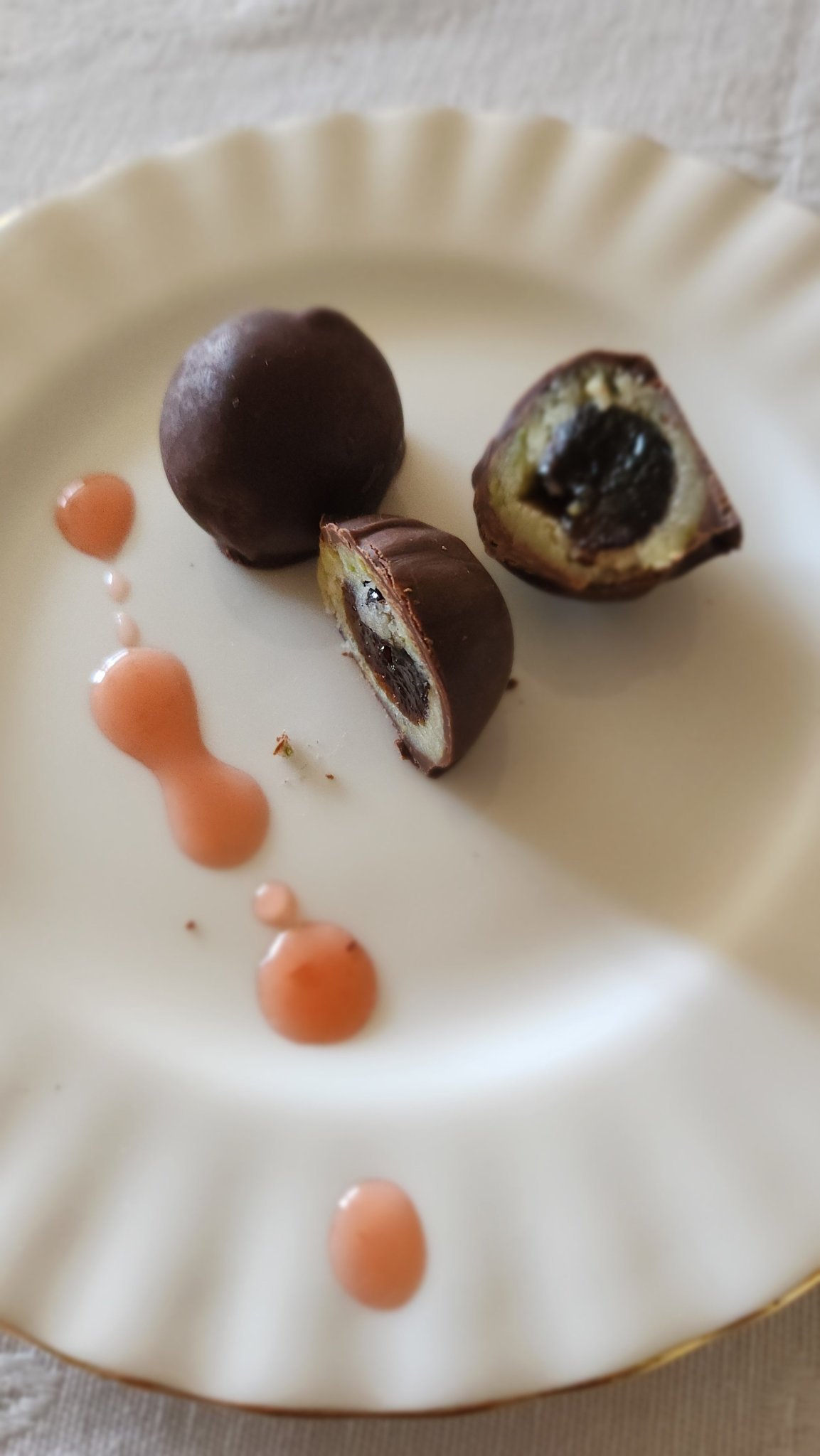 По чудо са останали 2 бонбона и от моя експеримент - идеята първоначално беше да направя Моцарт, но на село нямах лешникова нуга и я заместих с половин домашно озахарена черешка, че бяха големи. Черешите киснах първо в 2 с.л. бадемов ликьор, отцедих ги (тук тайно се изпива ликьорът Simple Smile ) и ги обвих в марципан, смесен със ситно смлян шам фъстък. Следва охлаждане  за половин час в камерата и топване в смес от разтопени млечен и тъмен шоколад с добавка на 1ч. л. кокосово масло. Станаха сполучливи, поне за вкуса на нашето семейство и гости (за гостите не мога да кажа дали са били откровени или възпитани).