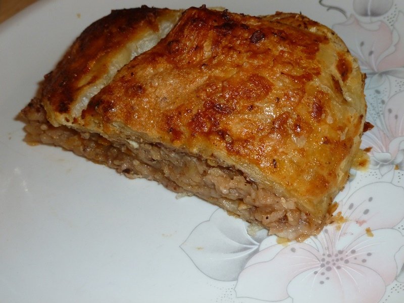 Това е една древна снимка на щрудел с бутер тесто. Със сметана, стафиди, орехи и кубчета ябълки.
