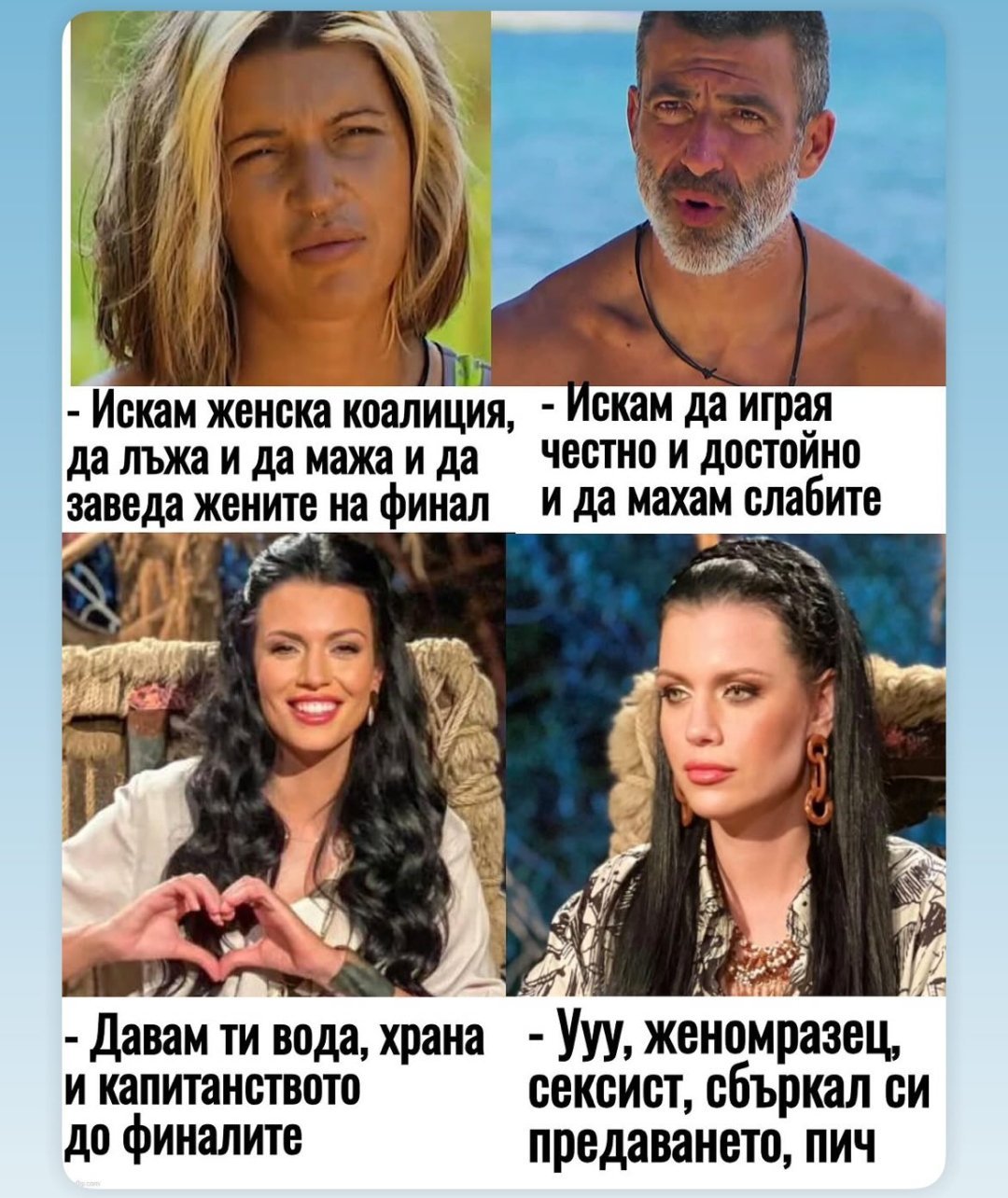 За анкетата- според мен се пропусна моментът, в който Ръждавичка щеше да поведе "хорото" на антипатичните- в седмицата, в която злобееше по повод на Лапунов. Мадам "Р" и Пекин са обичайните заподозрени. Духът на целия сценарий е изграден около концепцията за женомразството. Феминистките да гонят несбъдваемия блян за "женски" сезон и победител и сценаристите, които с всички сили доказват, че мъжете да сдържани, спокойни и далновидни, силни и смели. А жените са най-много "за цвят". За мен това е неприемлива гл.т., но жените във формата душа дават да докажат, че не заслужават да са победитеи. Как пък една не каза, че няма нужда на мъжете да увисват вериги, жилетки и други красоти? Или коментарите са забранени по договор? Финалната обща предколедна картина ще е, че жените са недостойни, но те са объркали играта и заради това мъж ще е победител, пък може би не най-достойният. Много християнско! Няма що! Прекрасна седмица ви желая!