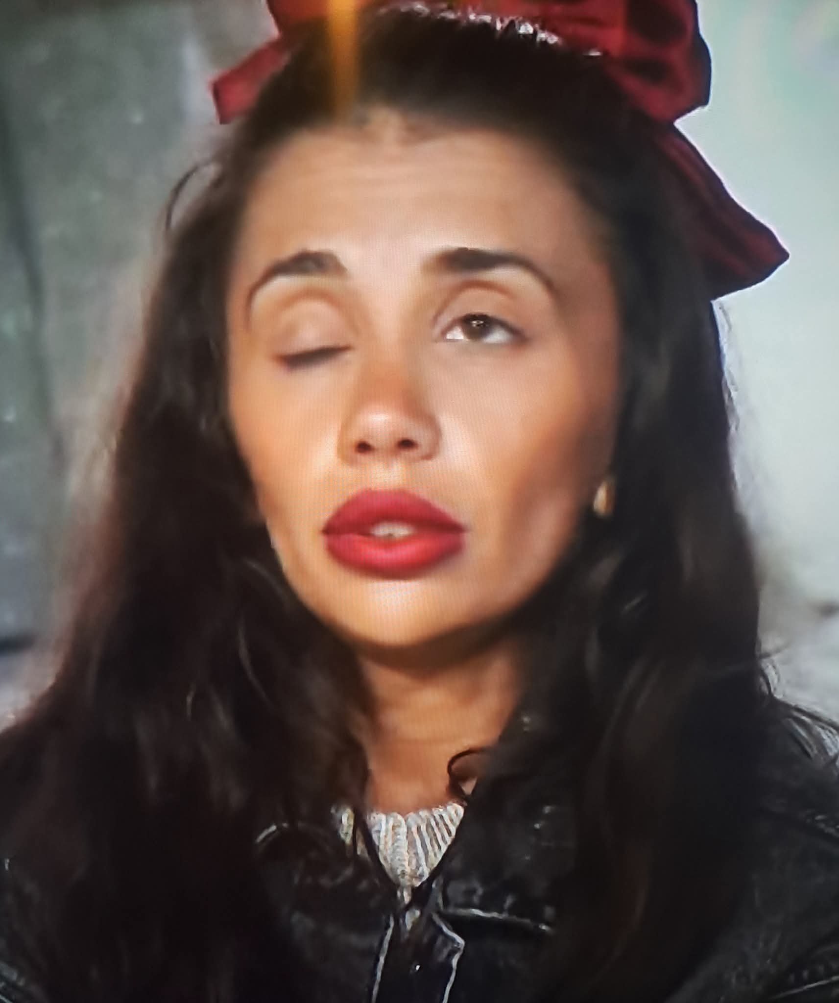 Не вярвам тези панделки да ги дават от продукцията- добре, Виктория на синхрони не е толкова зле, а на коктейлите се издокарва като ц***ска кръстница. Снощи с една червена пола, дънково яке, панделка?! Имам чувството, че нарочно така се облича и без никакъв грим на очите пък слага едно тъмно червено червило.