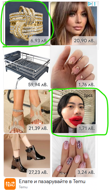 В момента съм на лаптопа и отстрани на темата ми излизат реклами от Тему - обувки, гривни (Шермин от там ли си ги купува?) и нещо като маска-уста като устните на Габи. Много тематични са повечето предложения, особено оградените, хаха Smile.