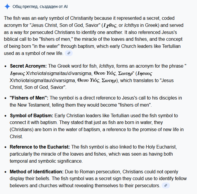 И за да не давам много линкове попитах AI  да систематизира причините рибата да е първият християнски символ: