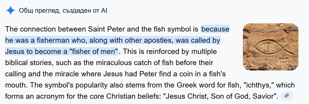 Добре, питай твоя „Каква е връзката между апостол Петър и рибата като символ на християнството?“ и чети.
