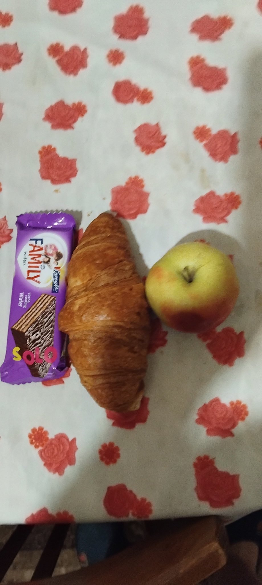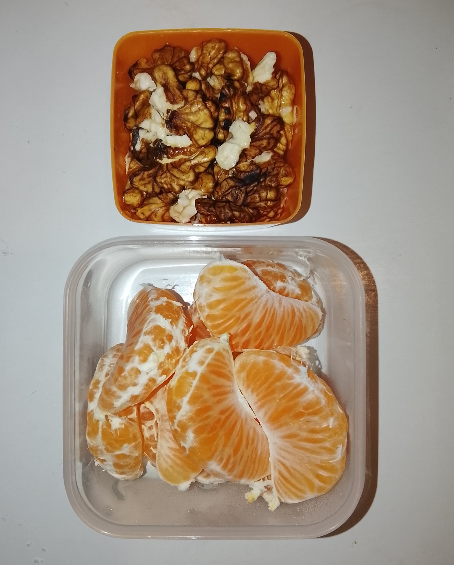 Днес не съм снимала, защото ще е за обяд на кетъринг. За закуска- хлебче с шунка и краставица, плодовете са мандарини и ябълка, има за следобедно- кексче с вишни и меденки.