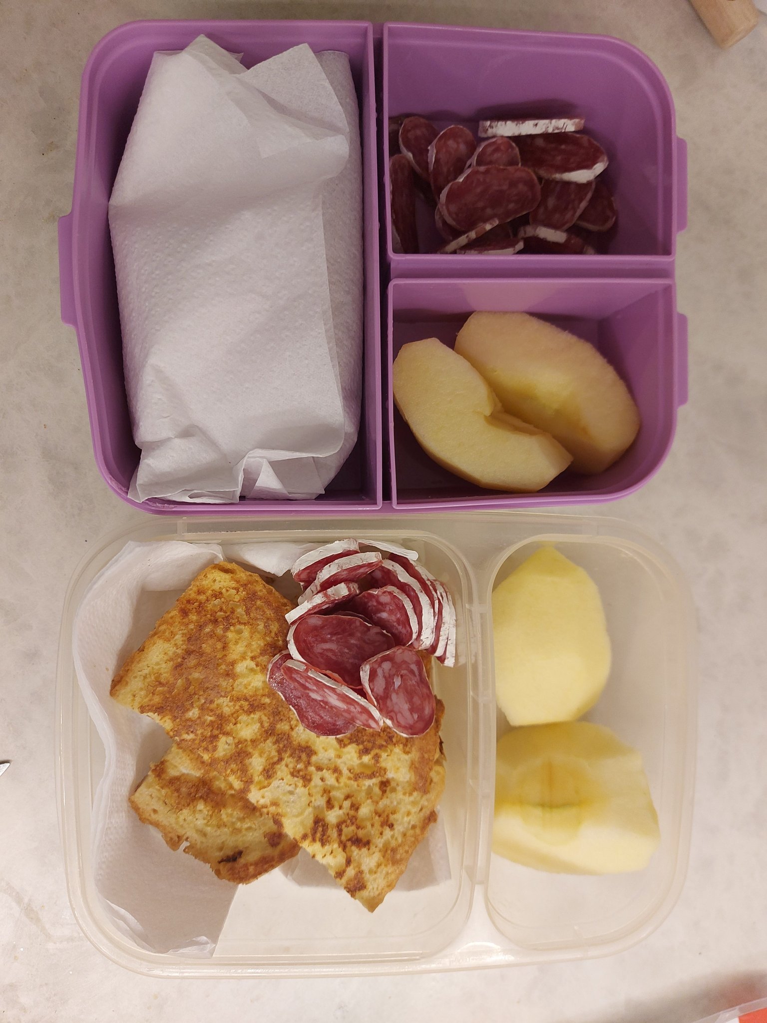 Кутиите от миналата седмица плюс трите до днес. Вчера беше бриош хлебче с масло, салами и зел. салата; мини киви, ябълка; днес имаме хлебче чабата с кюфте, малко кетчуп и горчица и зел. салата за цвят; кашкавал; орехи; морков.