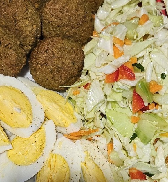 Фалафели, зелева салата, варени яйца и отделно млечен сос за фалафелите.
