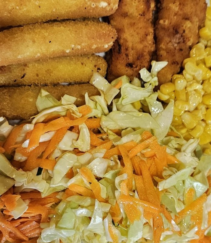 Пилешки хапки, кашкавалчета, царевица и зелева салата.