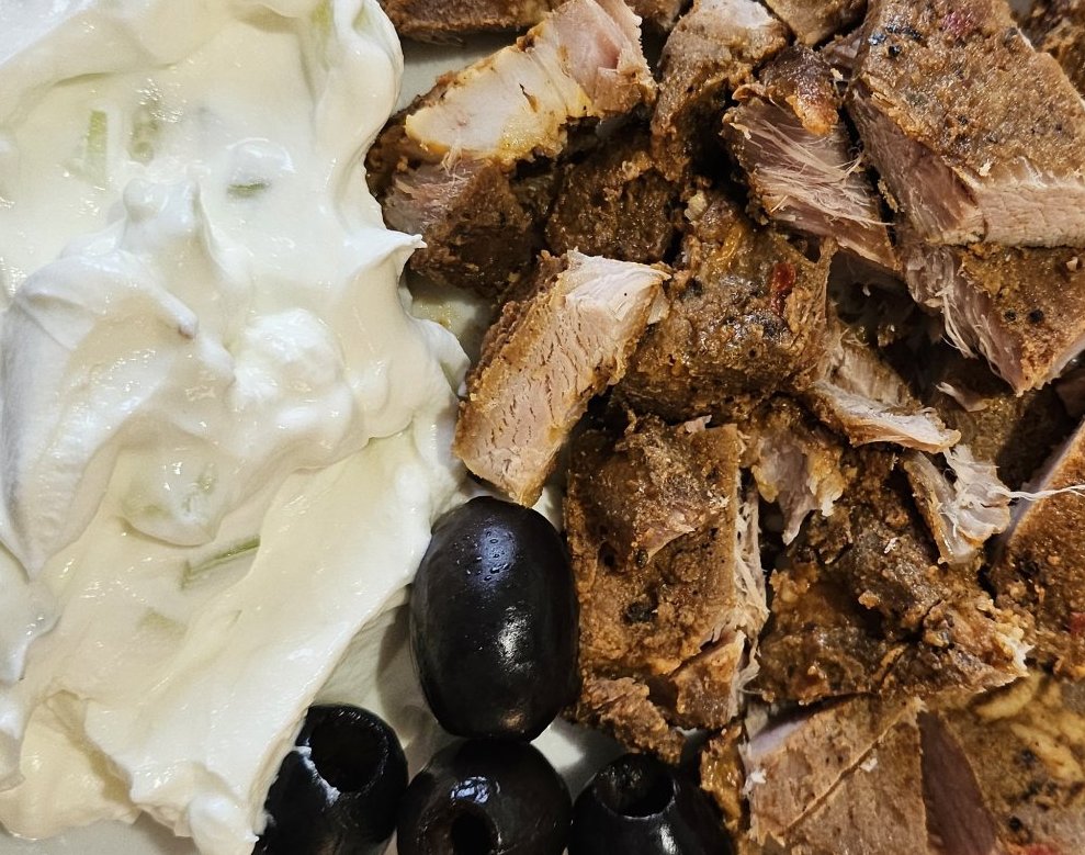 Млечна салата, пържола на фурна и маслинки.