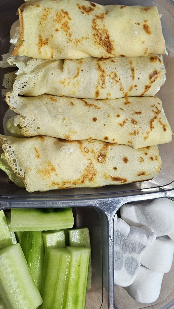Солена палачинка с пръчици, крем сирене, айсберг и сушени домати.