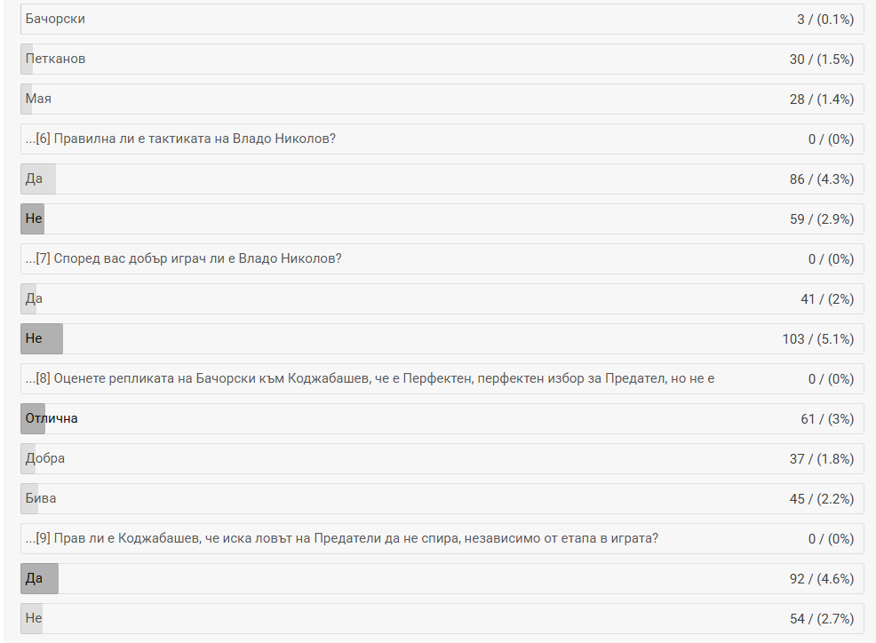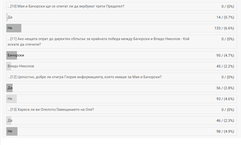 Макар че Бачорски е ясен на повечето, мисля че няма да отпадне, и ако Глория приеме да е предател, двамата ще спечелят.