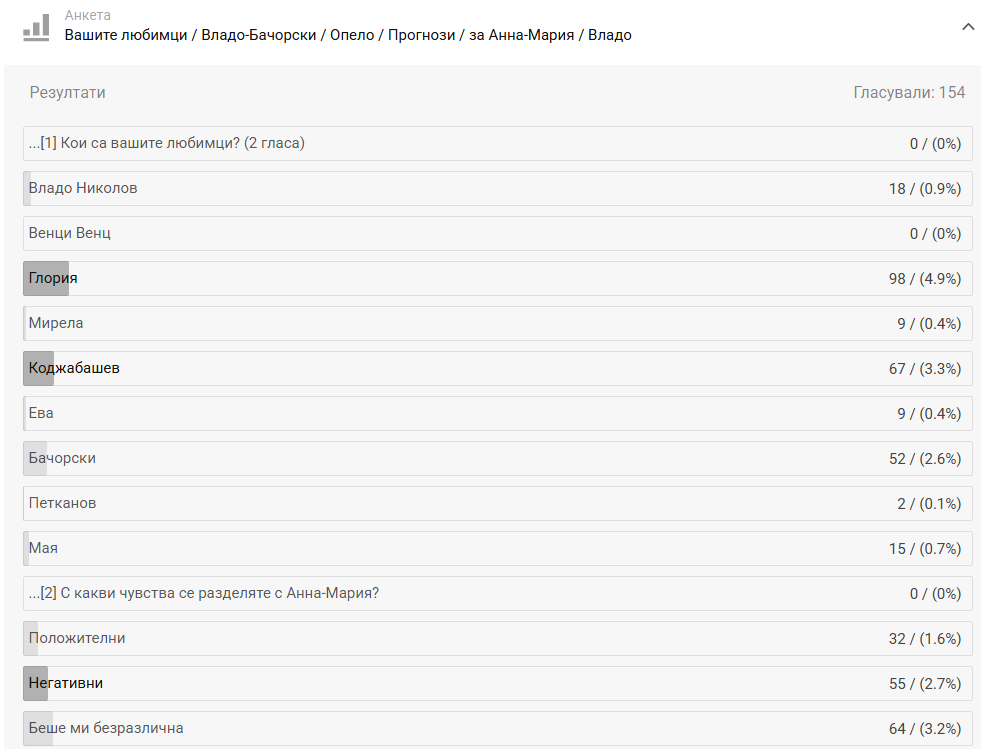 За Владо и Глория - изобщо не беше прекалена реакцията ѝ /не, че някой ще отговори нещо различно/, но и тази на Анна - Мария не беше. Blush