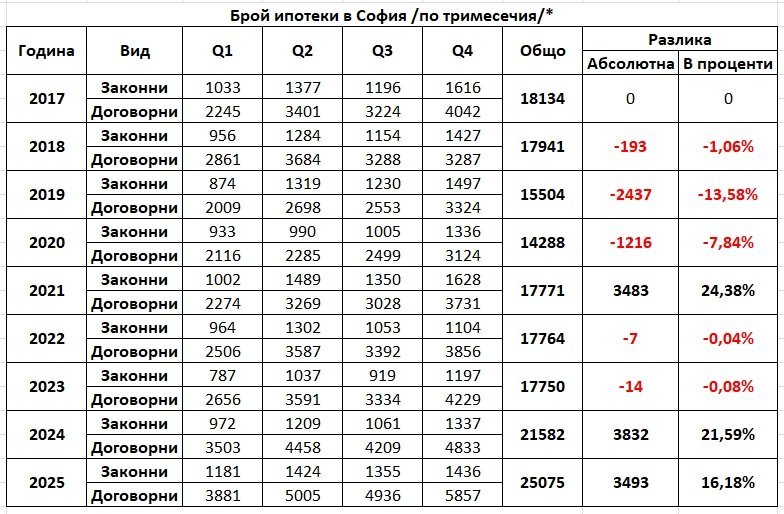 Мисля,че не интерпретираш данните коректно. Общо продажбите за София са се вдигнали с приблизително същия процент, с който и ипотеките на годишна база. За 2024 година ипотеките са 61.2% от всички продажби според твоите таблици, а за 2025 - 61.7%. Т.е. запазва се превеса на сделките с ипотека на същото ниво.