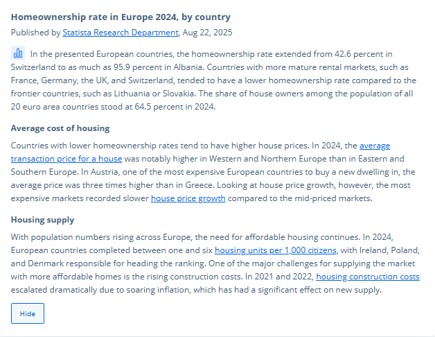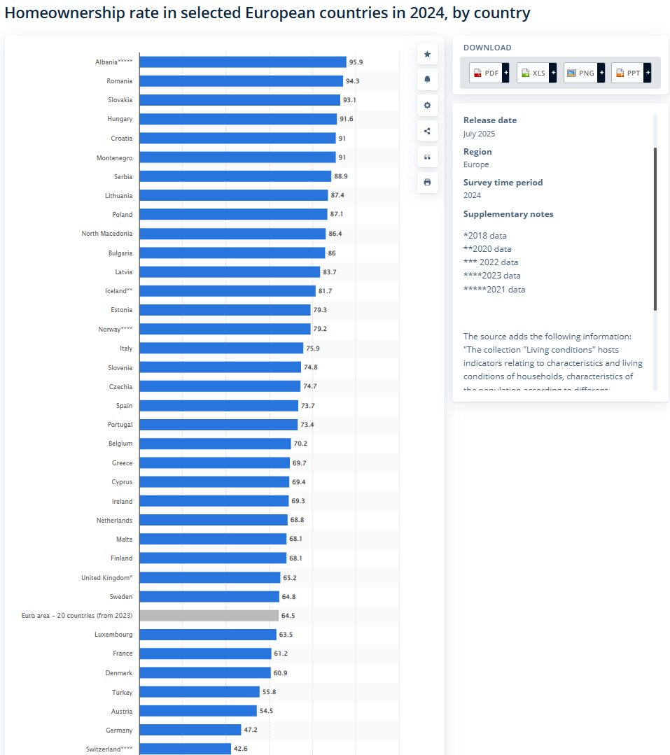 Според Statista в Румъния собствениците на жилища към 2024 г са 94% докато в България са 86%. По спомен, преди години тук също процентите бяха над 90 и бяха сходни с румънските.