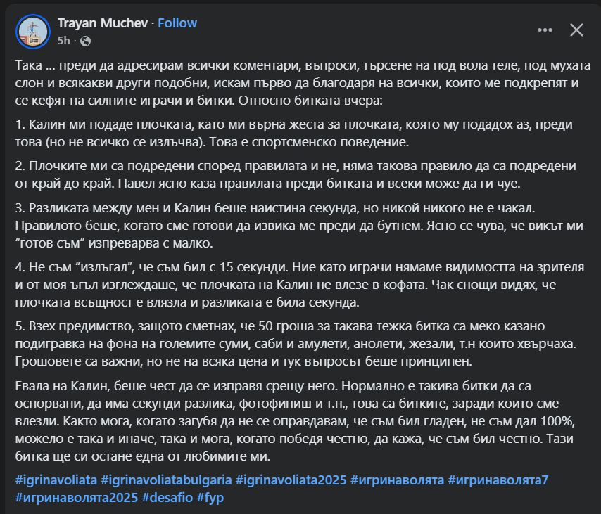 И още нещо интересно се присетих. Обръчите трябваше да ги минават на ръце задължително. За Калин знаем, че минава с лекота. Докато Траян имаше колебливи представяния досега на елементи с ръце. Снощи обаче ги мина. Бавничко, но мина. Може би от продукцията са заложили това условие като предимство за Калин...
