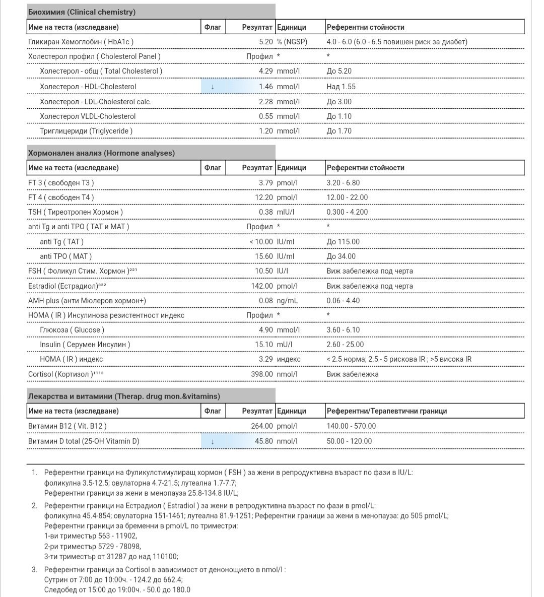 misssixty223,освен проблема с жлезата имаш висок инсулин(ИР),дефицити на Б12 и Д,триглицеридите трябва да са под 1.Предполагам и в другата тема ще ти кажат същото и ендокринолога ще ти изпише хормон за жлезата и метформинов препарат.Отсега започни да се информираш за ИР(има теми във форума)и вземай мерки с промяна в храненето и двигателен режим.Попълвай дефицитите.