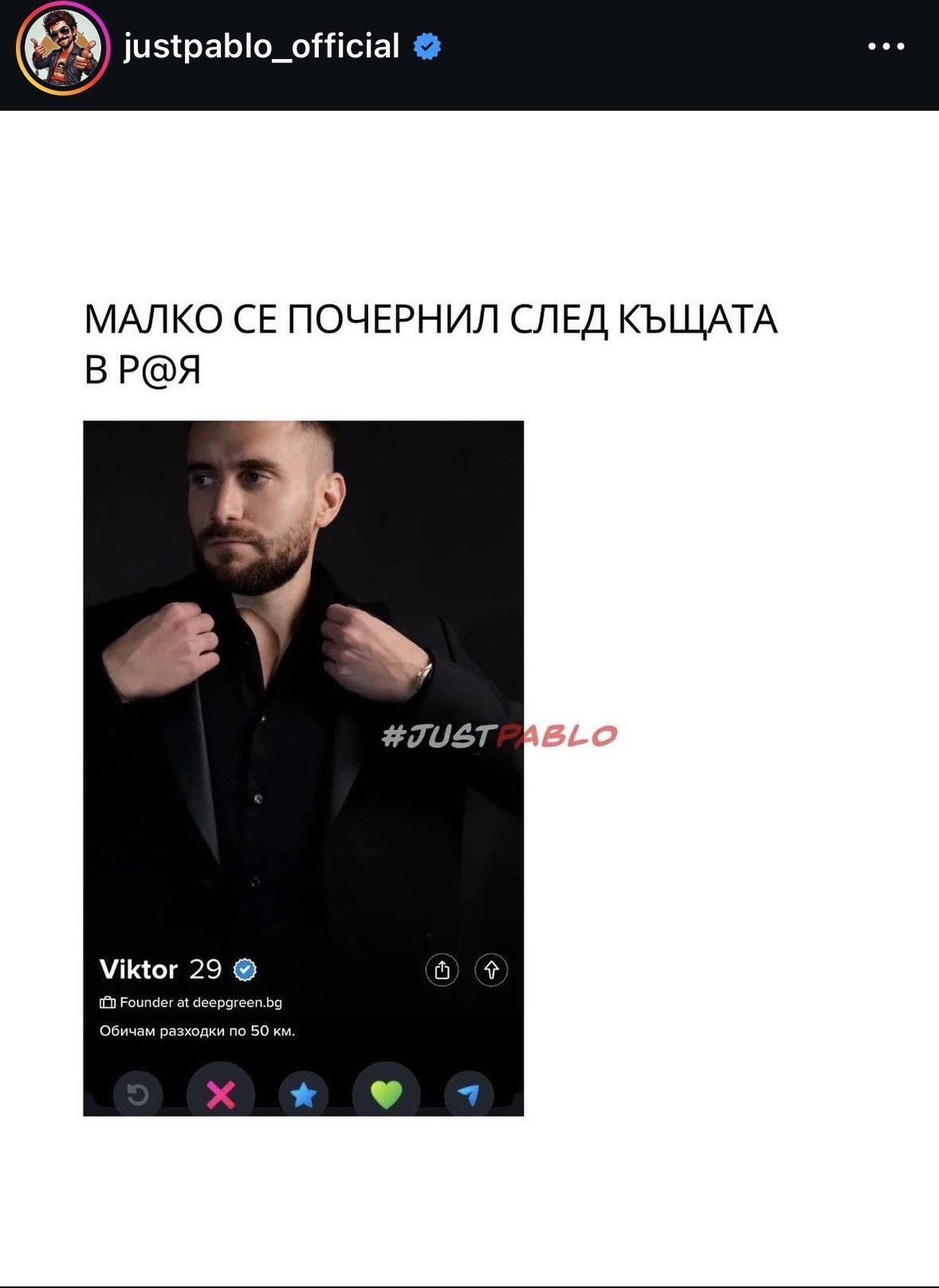 Благодаря за новата тема😊Днес попаднах на тая снимка в профила на Пабло - скрийншот на Виктор в профил в Тиндър(приложение за запознанство). Профила е верифициран, демек си е той.
