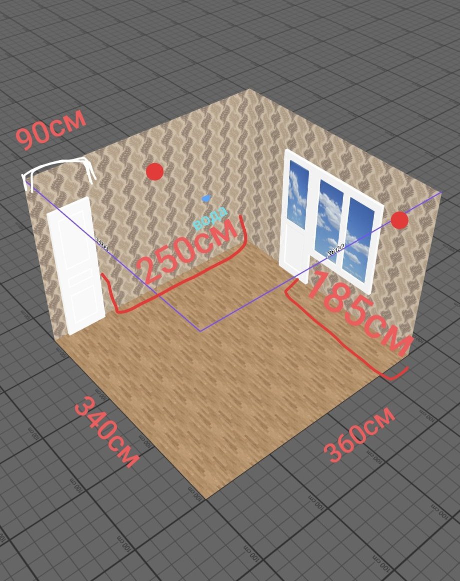 Момичета, ето я стаята която трябва да стане кухня. 340 на 360см е. Стената с прозорците е 340см, като свободната зона за поставяне на шкафове по нея е 185. Другата стена, на която се намира вратата е 360см, като без нея, свободното място за поставяне на уреди е 250см. Там е и водата, която се оказа че не е желателно да се премести, след консултация с майстор. Червените точки обозначават къде може да се върже аспиратор. Мислех печката да я сложа до прозореца най-вдясно, но нещо не ми харесва така сама да седи. Мислех там да сложа хладилника, пак не ми харесва, защото трябва да преминавам два метра разстояние, за да взема нещо от него. А пък до печката се ходи по-рядко, отколкото до хладилника. Понеже към тази стая има и остъклена тераса, си мислех и да свалим дограмата, този "зъб" който ще остане да му сложим отгоре един плот, за да стане работна зона и печката да заминава вън, (вече реших, че и пералня и сушилня ще отиват там една върху друга, терасата е 1 на 3 метра, те двете ще са в единия край, печката в другия) и аспиратора ще духа директно навън, старите собственици дори са подготвили дупка за аспирация на точното място, те също са готвили на терасата. На мен ми се струва ужас да готвя на терасата, ако не е интегрирана към стаята, не знам защо, но първо не знам как с тенджерите ще ходя навън и ще преминавам през вратата, и се сещам и за бабките как те масово готвят там. Бих го направила, ако нямам място или се налага, но при такава стая хич не ми се иска. Искам и да остане място за маса и малко диванче за 4-6 човека, или кухненски ъгъл, и един малък телевизор.