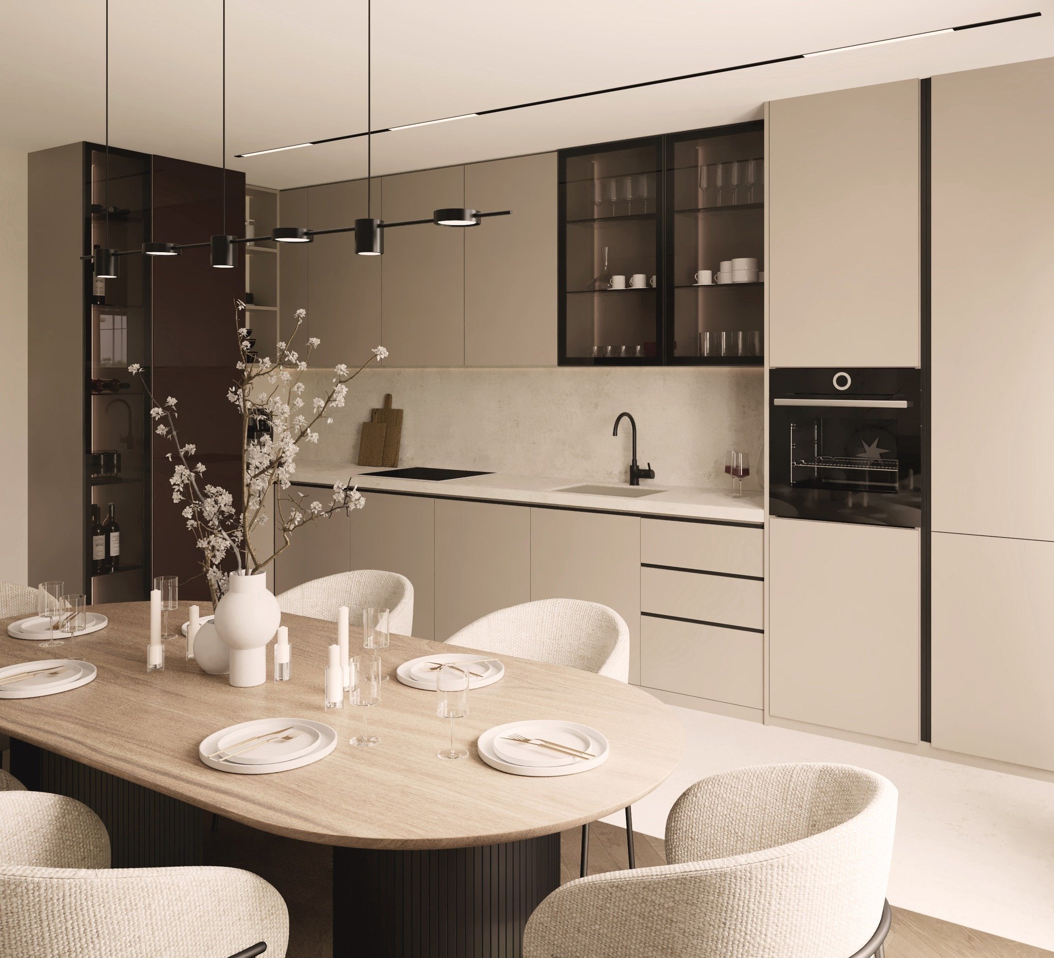 Моята нова кухня е много подобна, и правих доста опити колко см да е видимата част на черния профил на долните шкафове. Под 3 см е некомфортно и трудно за хващане, а тук са ги нарисували 1-2 см. макс.