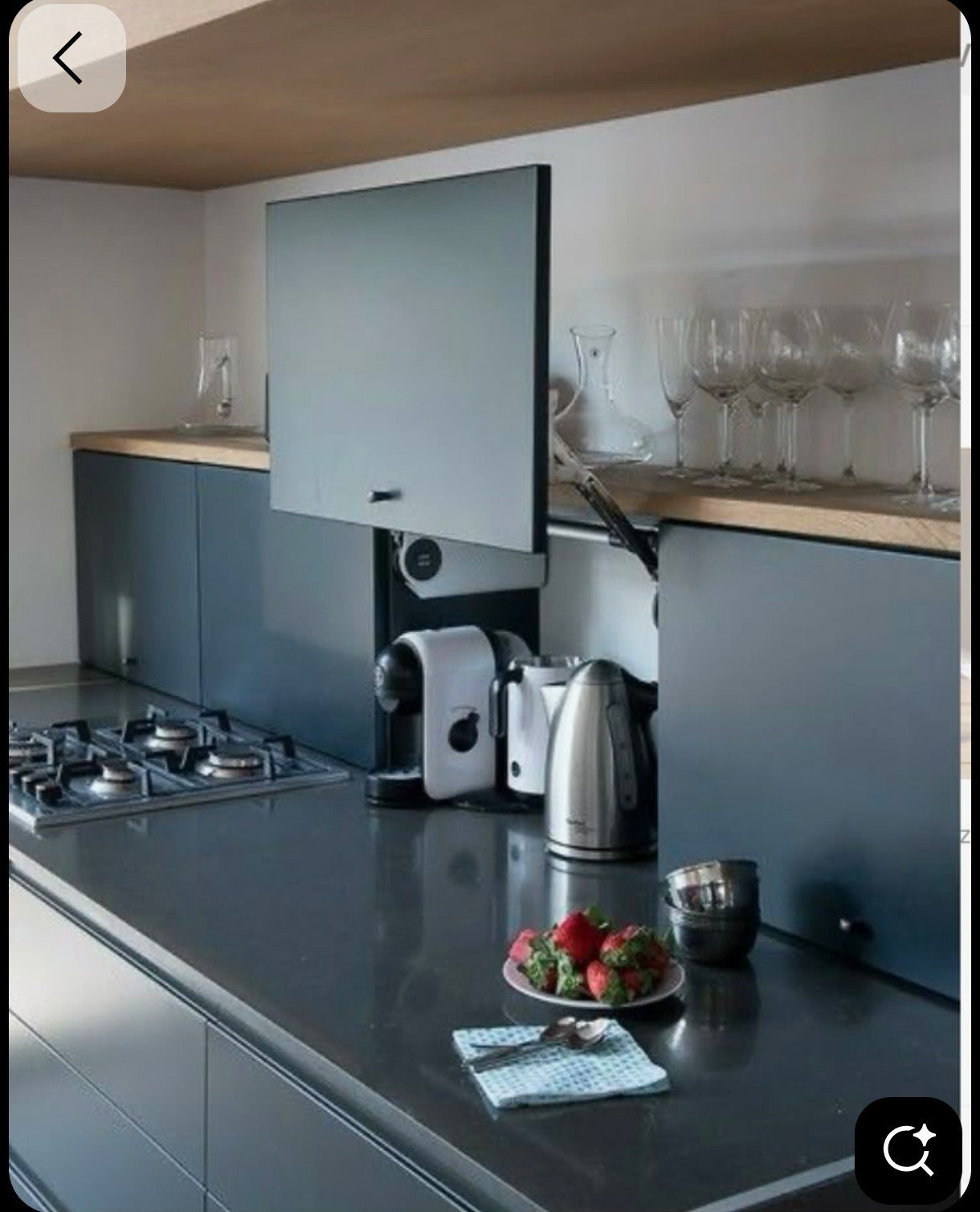 И двете идеи съм обмисляла, даже първата ми стои още на дневен ред за селската кухня, че е по-голяма и позволява подобно решение (тук от гледна точка на практичност намирам, че вратичките ще се почистват по-трудно от обичаен гръб, а все пак пред тях е работна площ и се работи с всякакви материали и продукти), но блендата под шкафовете за мен поне не беше удачно решение - трябва много да вдигна височината, за да е използваемо пространството за чекмеджета на колелца, а аз съм ниска и дори минималната височина на плота (с оглед вградените уреди) ме затруднява. За кухня с височина на плота 90 см вероятно ще е подходящо решение - трябва да обсъдиш с мебелиста и да съобразиш височината на готвещия в семейството.