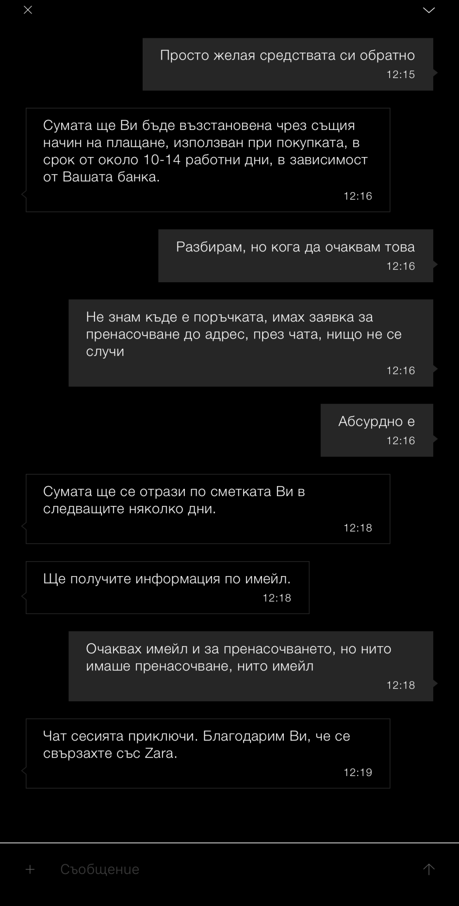 Всички куриери, с изключение на Еконт и Спиди, са пълна скръб. Забелязвам, че пренасоча ли пратка, без значение до автомат, пункт, за друг ден, значи няма да си я получа. Сякаш им отменям поетото задължение към търговеца и могат просто да напишат някаква глупост в тракинга като "Неуспешна доставка", и връщат пратката. По-скоро ще отида до края на града да си прибера поръчката. В чата на Зара много пъти ми отговарят отклончиво и нищо не казват, но поне във финансите са коректни. Може да не съм получавала пратки, но парите винаги са ми били върнати.