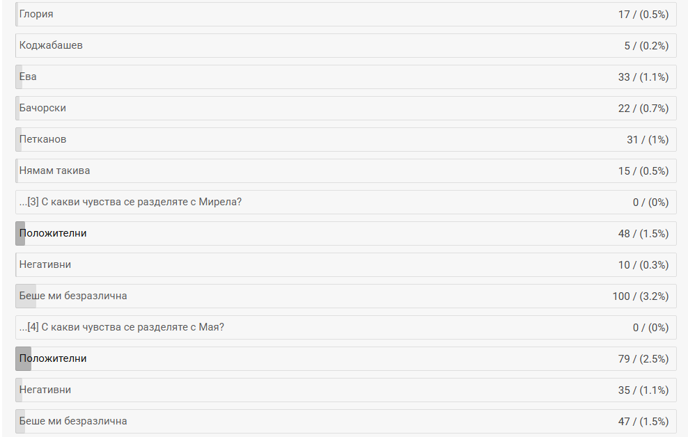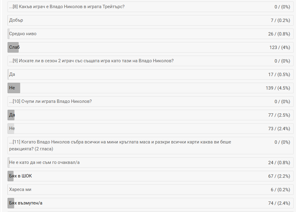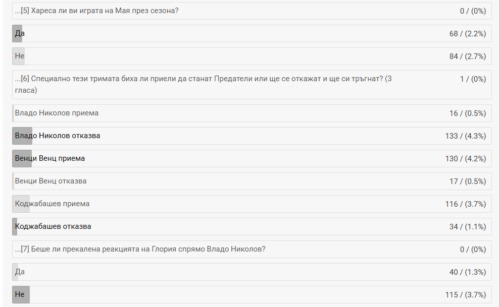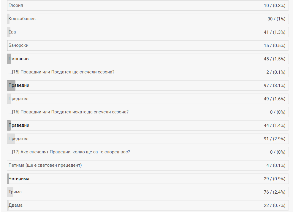 Резултатите от тези анкети винаги са нещо не съвсем у ред. На последните два въпроса - голямо мнозинство смята, че и 4-мата праведни мислят за втори предател, но иначе ако Глория е Петкан спечелили, то било защото искат парите, а не че търсели втори предател. Как ги съчетавате тези противоречия?...