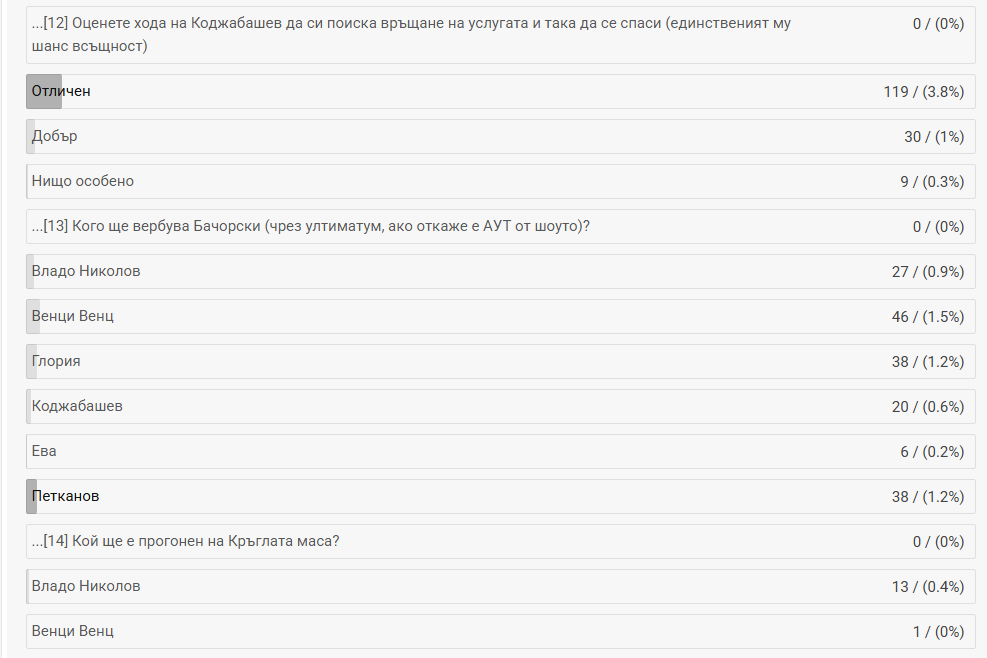 Бачорски постигна целта си и направи игра, която не е имало никъде по света, при това добра! Много се забавлявах на леките му гаври с останалите Joy Показа завидно самообладание, отлична актьорска игра, много находчив, много адаптивен, безмилостен когато трябва, отлични социални умения... направо си беше роден за тази роля и я изигра един път!