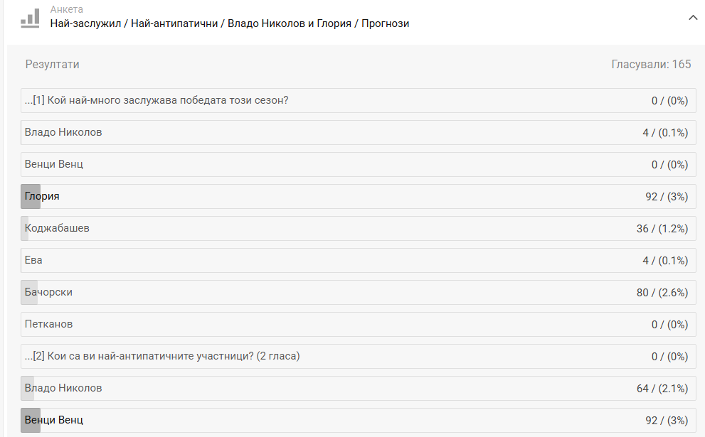 Може би, обаче ще са двама победители, защото до последно няма да си вярват другите. Не мога да кажа кои ще са, защото играта на Глория е крайно непредвидима.