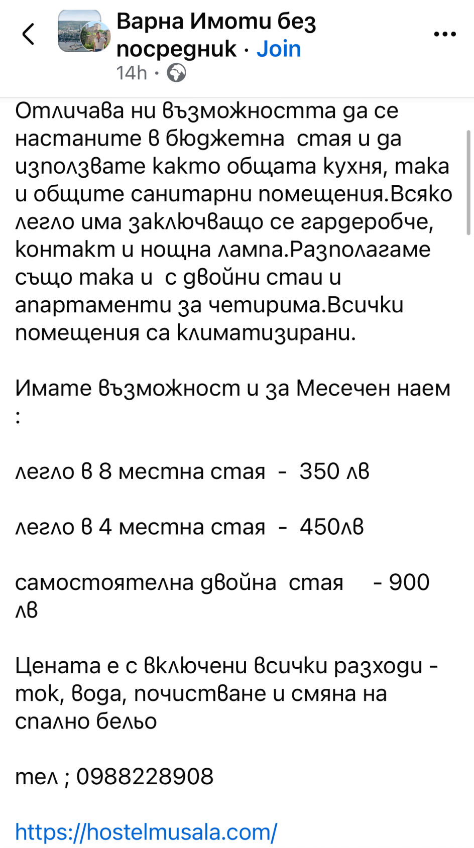Попадна ми рекламен пост във фб, центъра на Варна. Осем местната стая кърти.