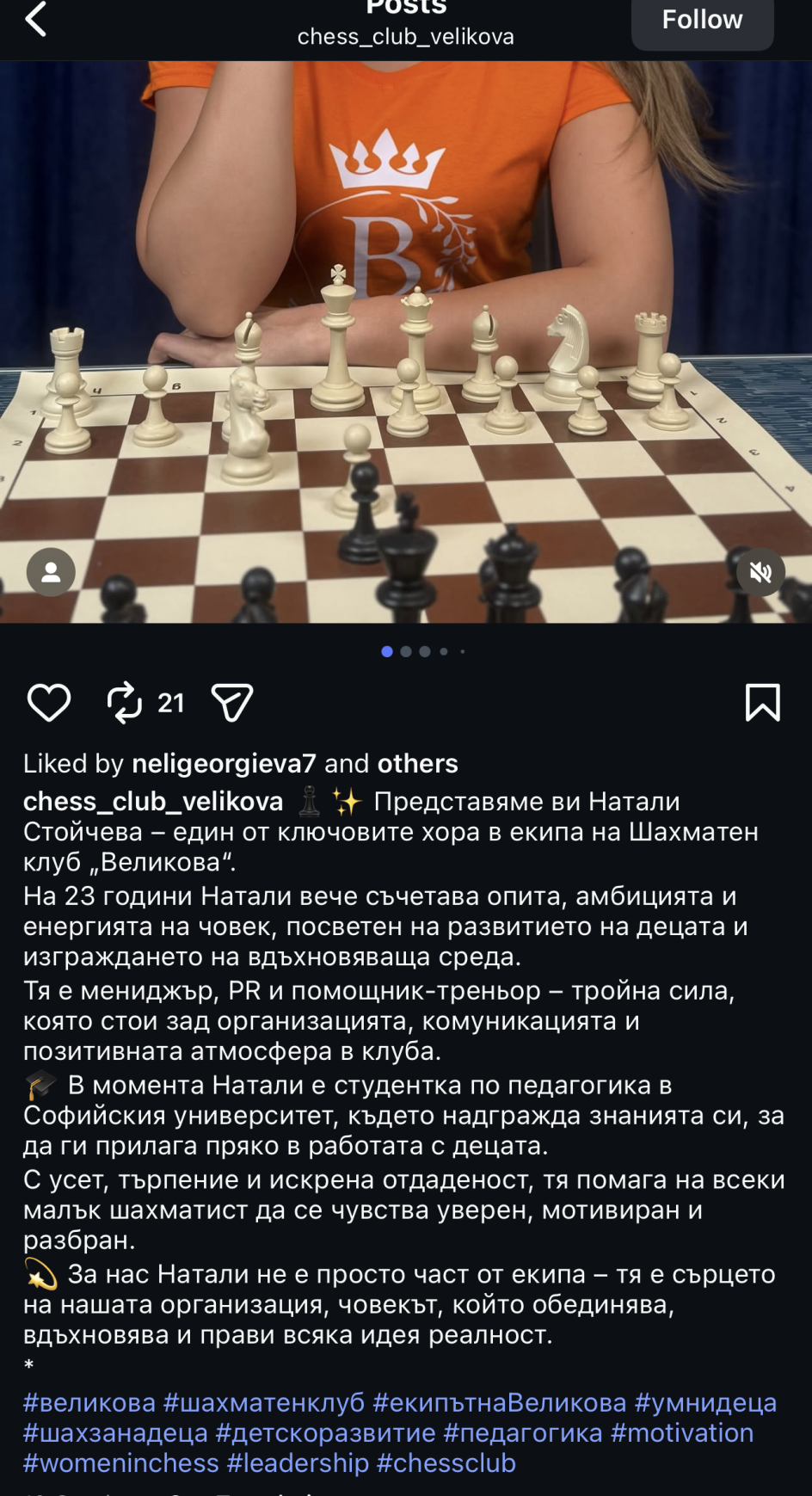Не знаех, че учи педагогика Натали. Браво на нея. Иначе, това че се занимава с шахмат определено също е в неин плюс.