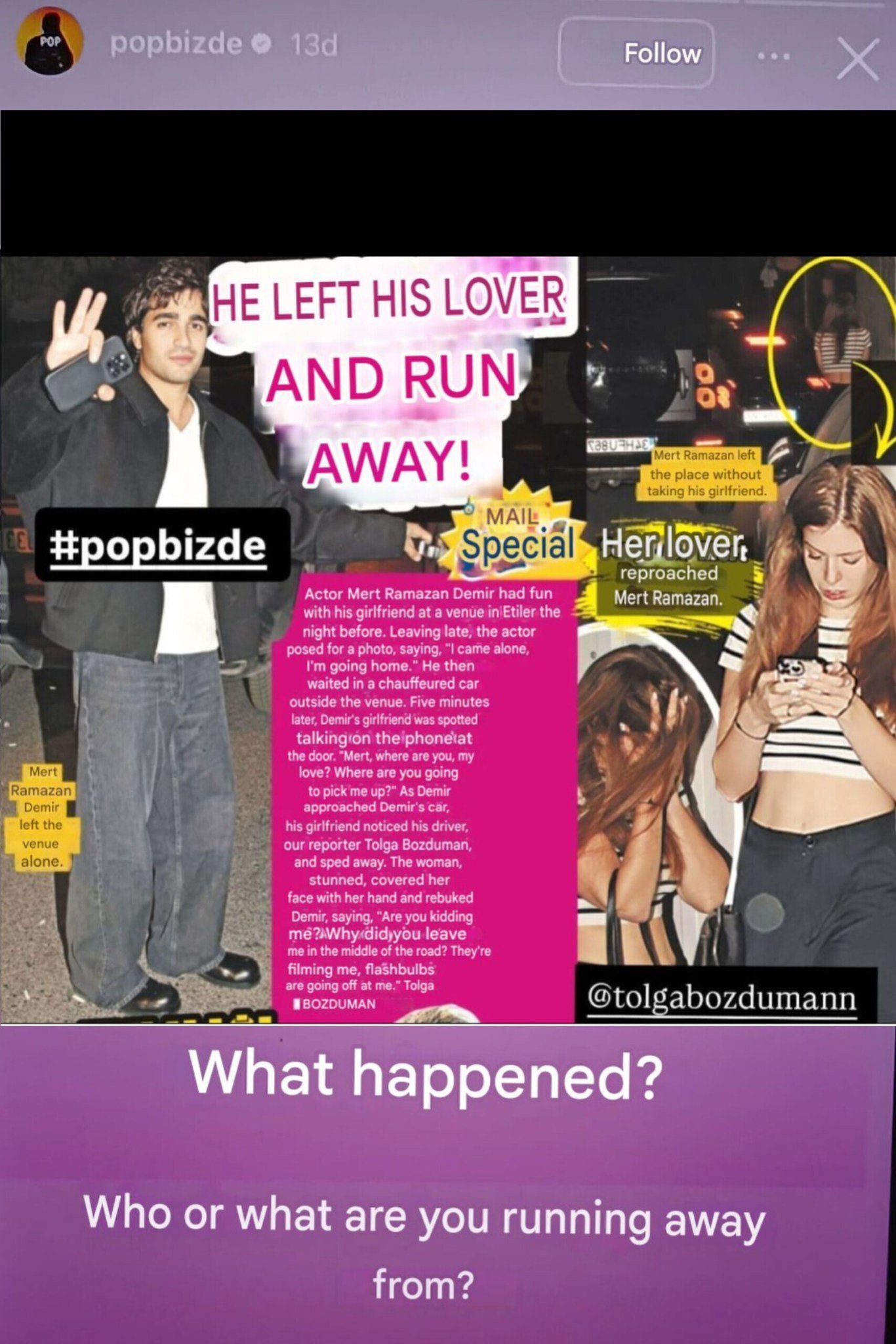 Аз не съм наясно защо все още се продължава внушението за това, че са двойка и всичко, което виждаме като репортажи всякакви е ПР? На всички е ясно, че се разделиха след "спокойното" празнуване на РД на Мерт, когато го хванаха (напоследък се случва често) репортерите в 4 сутринта с неговата мениджърка Мирай Кая да се "прибират" в жилището му в Джихангир. След това започнаха ПР акциите...моля ви, кой вярва на тези писания?