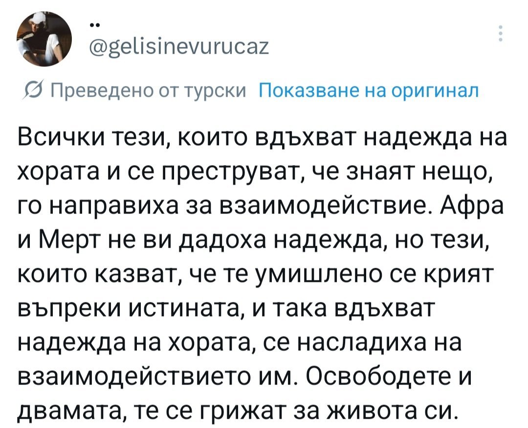 За  Мерт - пак било ПР ,за да помогне на Афра. Някои хора си го тълкуват както си искат , само и само да не  падне ореола му.  Аз пък си  имам свое мнение - да, заради  Афра , но не и за нейно добро.  Започнаха снимките на Пера - появи се Селин. Сега започва излъчването на  ABI - пак постановки - просто отклонява вниманието  от работата на Афра. Като прът в колелата ѝ ми стои цялата работа. И не ми  е ясно , защо още спрягат имената им заедно. Като видя нови колажи  и ....... смях.