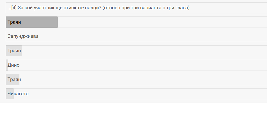 Тотално зачерквам Траян и Дино, които бяха мачкани от Миро в коалиция с Пекин и Сапуна. Обаче сега големи авери станаха с Мирцата, особено Дино, голямо мазнене... просто отвратително!!! А Чикаго... най-силния мъж, който може да бие всеки, си потъпква достойнството да се мазни на Миро, пак на Миро... като кученце ляга по гръб и дава корема, да го почешат стопаните... силно разочарована съм.