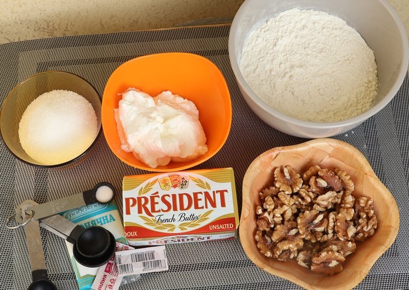 Тесто - 250 г бяло брашно от висок клас,  90 г  краве масло Président, 150 г заквасена сметана Président, ¼ ч.л. сода бикарбонат и ¼ ч.л. сол.