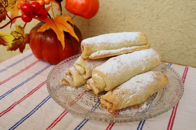 Режа, беля и настъргвам около 500г тиква, която задушавам с масло, захар и канела в тенжера. В отделна купичка се разтопявам масло, с което намазвам всяка кора преди плънката. Навивам и слагам в намазнена тавичка, отгоре накапвам още малко масло. Пека на 180° С за около 40 минути. Вкусотияяя!