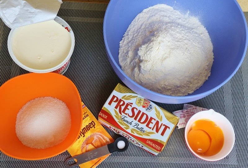 Маслено тесто: 300 г бяло брашно, 150 г студено краве масло Président, 50 г студена заквасена сметана, 50 г захар, 2 жълтъка, ½ ч.л. ванилия на прах, 8 г бакпулвер, щипка сол.
