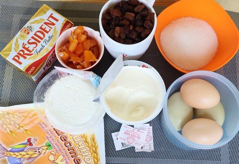 Пълнеж: 600 г готварска извара 9%, 4 броя яйца L, 50 г студено краве масло Président, 100 г захар, 50 г царевично нишесте - 50 г, 180 г стафиди + 1 с.л. брашно, ½ ч.л. ванилия на прах, щипка сол