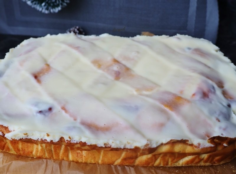 Поставете лентите тесто диагонално върху плънката от извара, първо в едната посока, след това в другата. Можете да украсите чийзкейка красиво по различни начини, в зависимост от въображението ви.