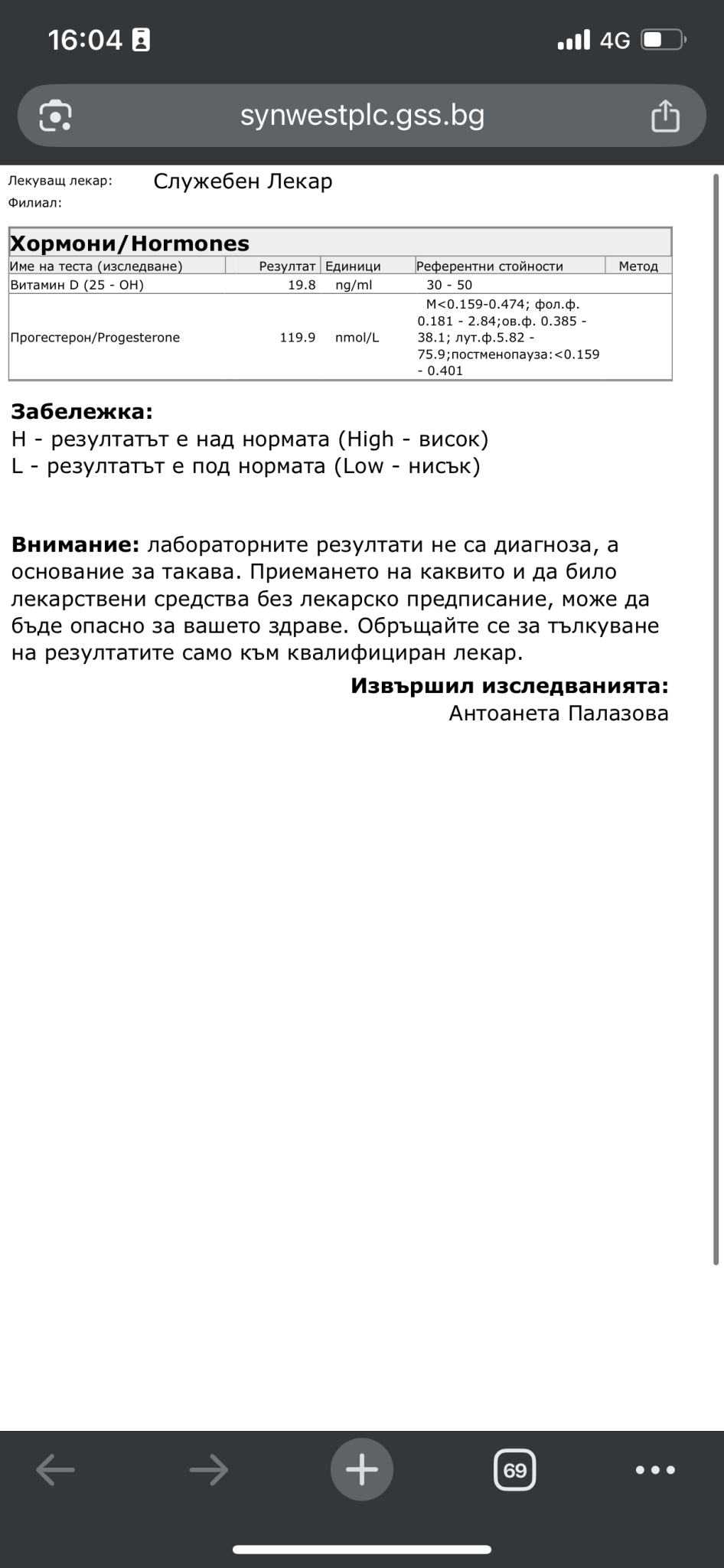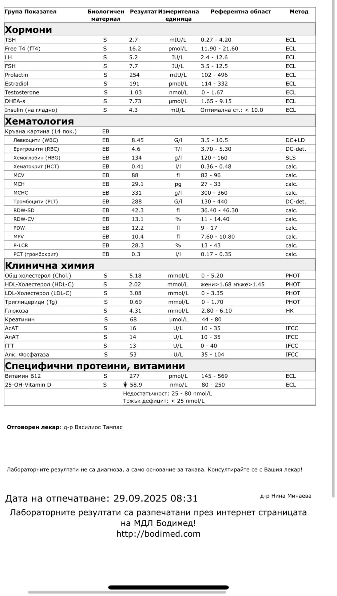 Имаш Хипофункция на ЩЖ. Вит. В12 и вит. Д са ниски, трябва да ги приемаш. Другите изследвания са добре, не показват проблем.