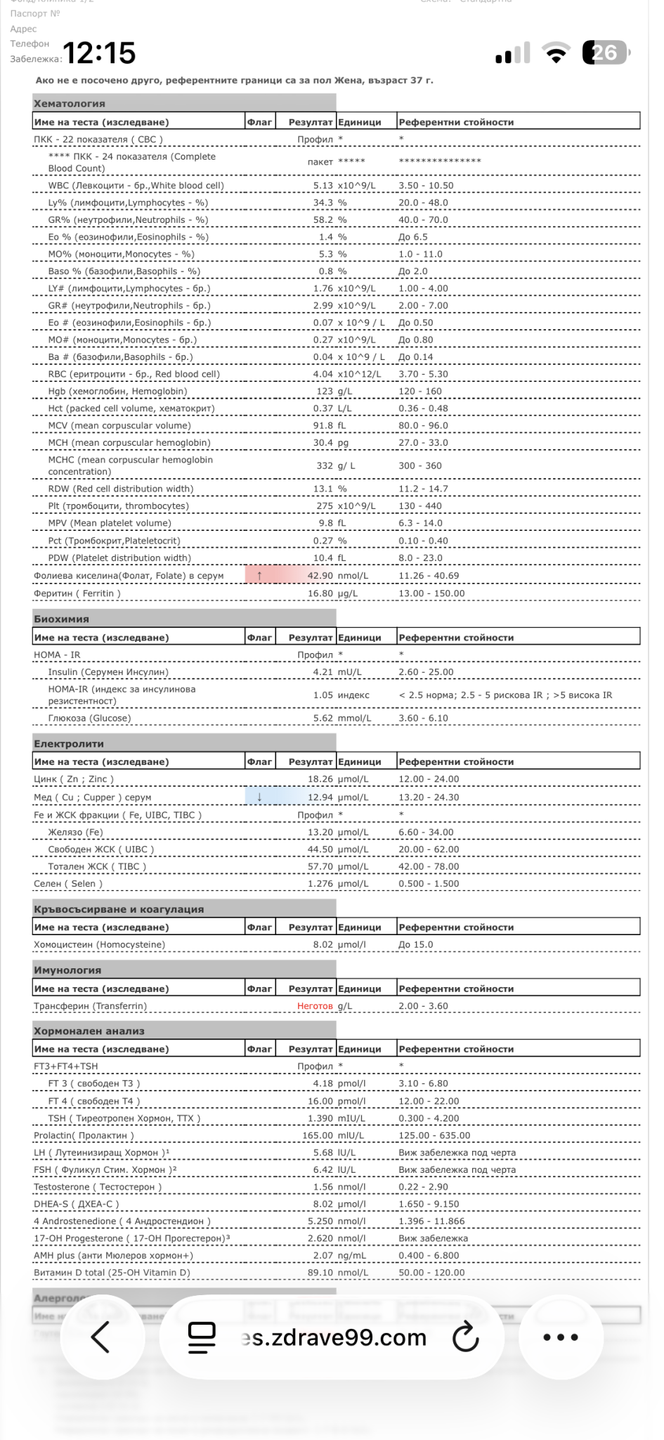 @denis, под тест за ИР обременяване с глюкоза ли се визира? Защото тест за инсулинова резистентност имам направен в това изследване. Относно добавки, приемам мио инозитол, комбиниран с фолиева киселина от доста време, както и напоследък по-ниски дози витамин Д на BetterYou. Цинк не съм приемала и не знам защо медта е в това положение. Благодаря за отделеното време! 🍀