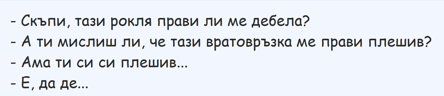 Не зная как мъжа може да те намери за напълняла, като те не могат да забележат че си ходила на фризьор дори, а надебеляването е на принципа на варената жаба - става постепенно, по килограмче на месец два. Окото му свиква, той се пренася в новата реалност и хоп всъщност Митьо 100те манекенки харесвал дебеланки.