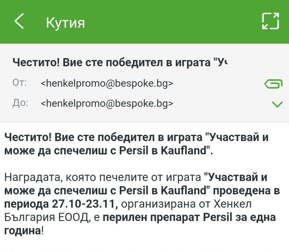 Вчера питах за Персил, а днес зарадваха мене и мъжа ни с имейли. С по една бележка бяхме - ползваме продуктите. Който си има късмет - си има. Месецът започва супер, пожелала съм си 31 награди.