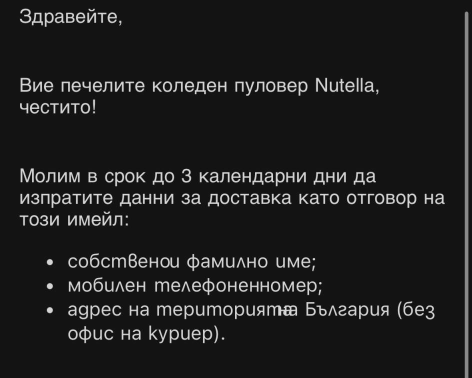 Честит нов месец! За мен започва изключително радостно! Спечелих пуловер от нутела! Пожелава си както на мен така и на вас много награди! Така силно искам пирамидата на Фереро.. /след 4 дни имаме рожден ден със сестра ми и много бих искала да я спечелим/ Усмихнат и много топъл месец!