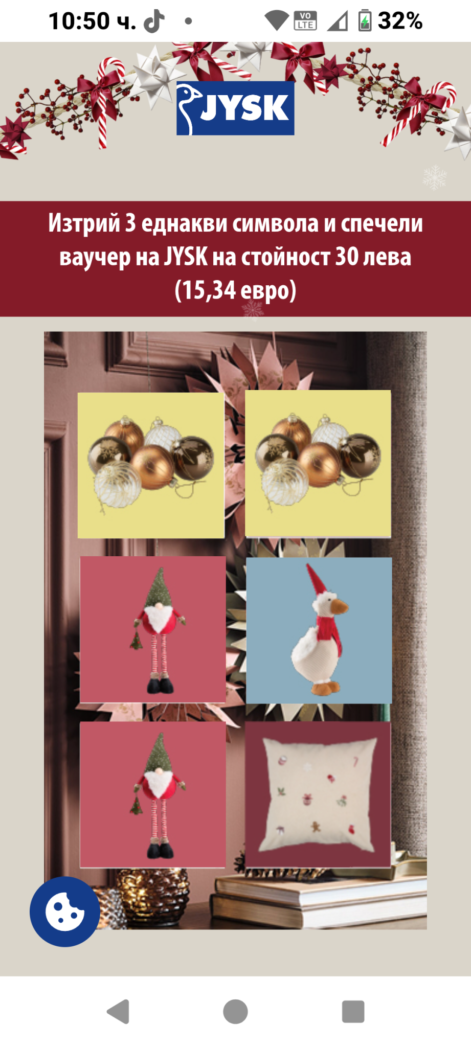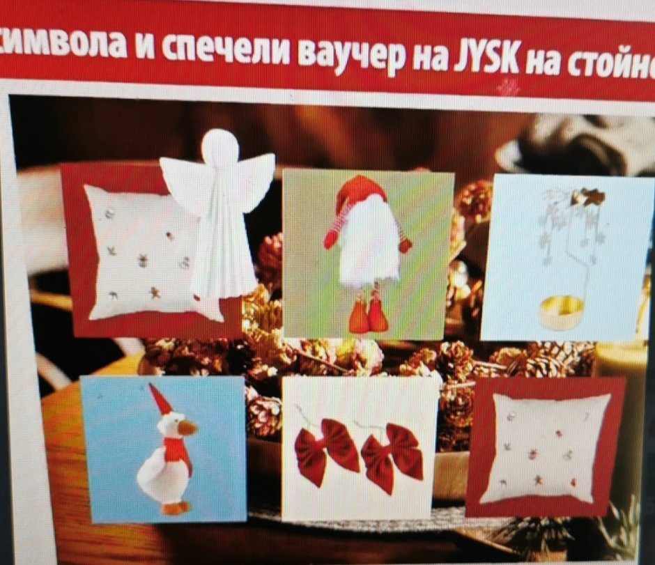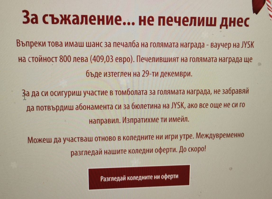 Аз имам един въпрос, свързан с коледния календар на JYSK - днес го изтърках и ми се появиха 6 прозорчета със съобщение, че при 3 еднакви символа се печели ваучер 30 лв. Еми изтрих 3, естествено не бяха еднакви, но успях да изтрия и останалите 3 след това. Ами много се изненадах, че реално нямаше 3 еднакви символа... За съжаление неможах да направя екранна снимка, тъй като много бързо ми изкочи съобщение, че не печеля (то реално ако няма  3 еднакви символа, естествено, че няма как да спечелиш...). Някой да е забелязал нещо подобно?