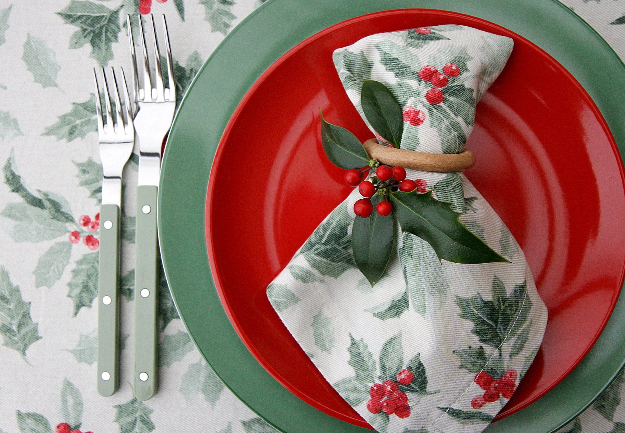 От лявата страна на чинията се поставят вилиците, а от дясната лъжицата и ножовете. Най-близо до чинията се намира ножът за основното ястие (3), след него супената лъжица (1) и най-отвън е ножът за предястието. Разположението на вилиците е аналогично – от вътрешната страна е вилицата за основното (5), а от външната е тази за предястието (4).