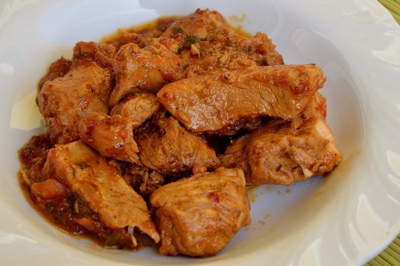 чахохбили с пуешко https://pep-4o.blogspot.com/2018/07/blog-post_18.html Подправката хмели сунели е специфична, има я в Берьозка  и ще притъпи, щом го усещаш. На пуешкото аз усещам по-стегнатата структура на месото, като  на домашно, не и специфична миризма.