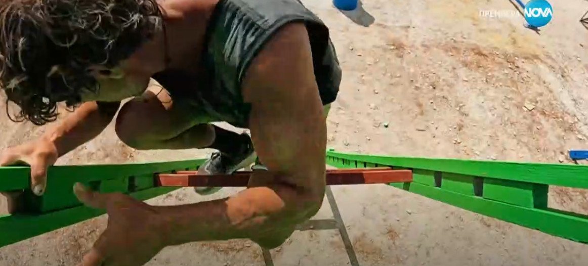 Обаче сега вижте жълтата стълба. Тя няма нищо общо с предните две като изработка.Правена по друга "технология" от не съвсем прецицен дървар, точно дървар а не дърводелец. И точно на този кадър Радостина с усилие се мъчи да помръдне долния профил и ТОЙ НЕ ПОМРЪДВА. Нещо не е наред тези отвори, мерено е със шублер но рязано с моторния трион. Не че щеше да спечели играта но сега и у мен остана един леко горчив привкус. Подсигурили са се с жълтата стълба да не спечели. Или просто късмет и тя изтегли късата клечка. И като му слушам сега на Алекс умозаключенията за физиката, за бутането и тегленето ме напушва един смях. На какъв  ли елемент ще го прецакат и него.