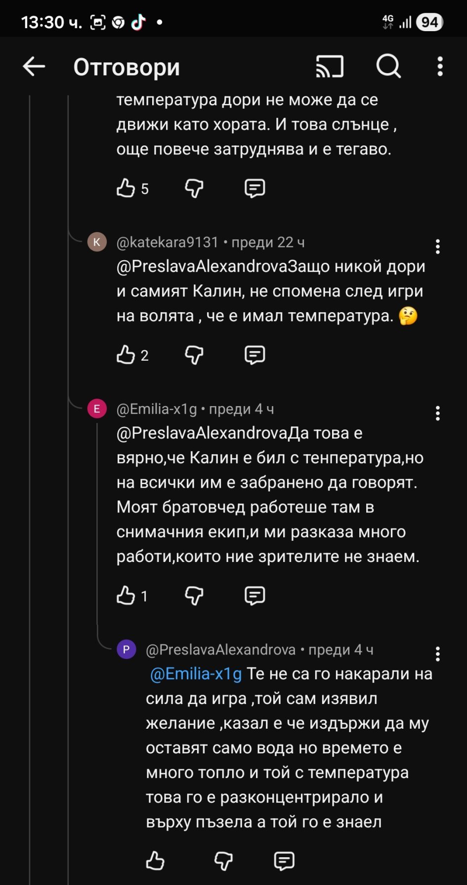 И аз съм склонна да вярвам на това. Имаше индикации в дните преди финала, че Калин е болен. Първосигнално си помислих, че е зъбобол, така докосваше дясната си буза отвреме-навреме. Но няколко случайни кадъра ме усъмниха, че има хрема и го боли гърлото. Пиеше лимон на лаптопа на Николета, а при един разговор с Алекс на верандата Калин говореше на носа си, дишаше с отворена уста, преглъщаше внимателно, абе изобщо изглеждаше като болно дете 🙂.