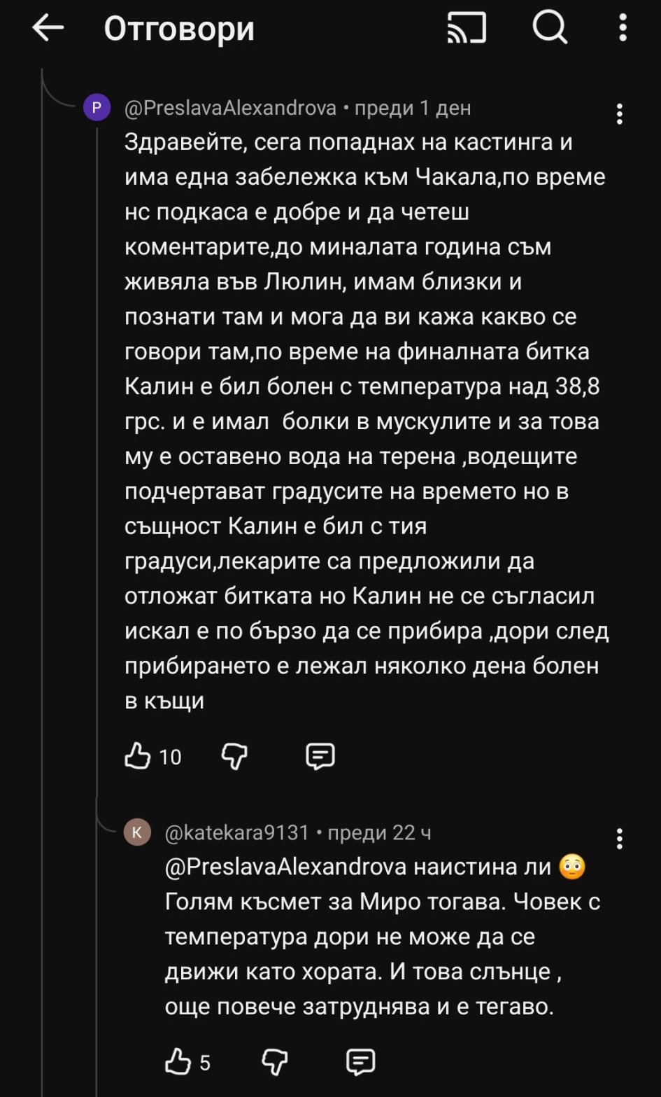 И аз не винаги бързам да се доверявам на слухове от непознати хора, но тук съм склонна да го повярвам, защото това би дало първо смислено обяснение за формата, в която се намираше Калин на финала, различно от "казаха му да падне" (това не го вярвам) и Миро е по-добър (това пък грам не го вярвам, при цялото влачене на Калин той имаше много малка преднина на пъзела). Наистина видимо не му беше добре, а къде къде по-изтощаващи битки и елементи е минавал с лекота дори на изолатора.